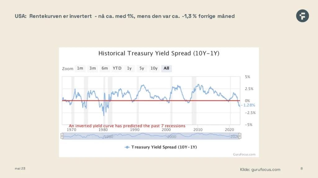 Som grafen over viser er rentebanen invertert i USA. Det normale er at rentekurven er stigende, altså at renten for lån med lang bindingstid er høyere enn for lån med kort bindingstid. Dette skyldes igjen at investorene krever en høyere risikopremie for å låne ut midlene over en lengre periode, og/eller at verdien på lange lån svinger mer enn på korte. En omvendt, eller «invertert» rentekurve markerer et punkt på et diagram hvor de korte rentene krysser de lange, altså at korte renter er høyere enn lange. Dette følges tett av investorer, fordi inverterte renter har vært en ganske pålitelig indikator for en forestående resesjon (negativ økonomisk vekst i to eller flere påfølgende kvartaler) i amerikansk økonomi. Siden 1960 har alle – bortsett fra én – resesjon/lavkonjunktur blitt varslet av inverterte rentekurver i forkant, fortsatt i USA.