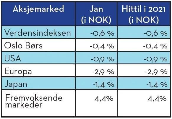 Aksjemarkedene åpnet friskt i begynnelsen av januar og fortsatte den sterke oppgangen fra måneden før. Spesielt var fremvoksende markeder friske, med en oppgang på over 9 % i lokal valuta, før optimismen forsvant og senket markedene igjen. Øvrige markeder var også godt opp, før nedturen kom mot slutten av måneden.