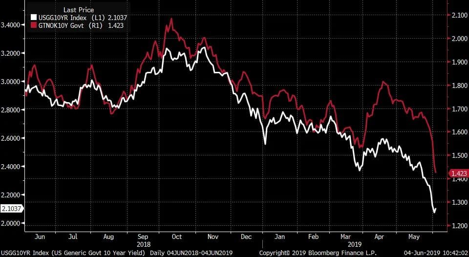 I de fleste land, hvor lange renter ikke har vært tilnærmet lik 0%, har fallet vært betydelig siden slutten av fjoråret. I grafen under ser vi at lange renter i USA, for eksempel, har falt fra 3,20% til nesten 2,00%. Dette er mye i rentemarkedet! Også i Norge har lange renter falt mye. Et slikt rentefall er et klart «risk-off» signal om at investorer flytter penger fra risikable investeringer til mindre risikable investeringer i frykt for markedsfall. Utgangen i kredittrisiko premier de siste par måneder er et uttrykk for det samme. Fallet i lange renter er også et uttrykk for at markedsaktørene forventer lavere økonomisk vekst fremover, tiltagende frykt for resesjon frem i tid og økende sannsynlighet for kutt i sentralbank renter der hvor det er mulig.