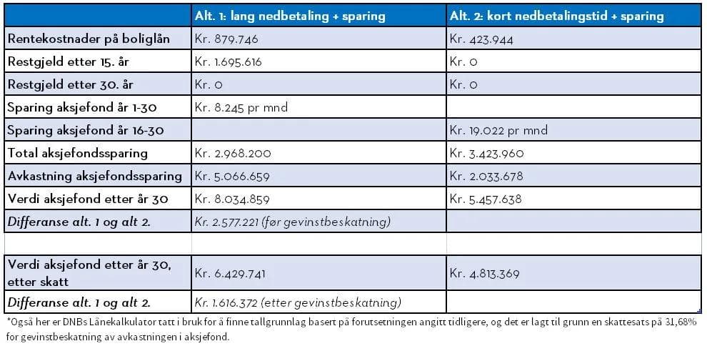 Som sammenligning ville man da for alternativet med 15 års nedbetaling (alternativ 2) startet med aksjefondssparing etter det 15. året, med det beløpet man til da hadde betalt i renter og avdrag, og hatt sparingen frem til år 30. For alternativet med 30 års nedbetalingstid kombinerer man en lavere nedbetaling av boliglånet (lavere avdragsbetaling) med aksjefondssparing over 30 år.