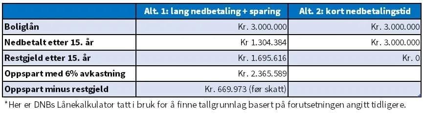 Det beløpet som i alternativ 2 brukes som ekstra nedbetaling av boliglån brukes i alternativ 1 til å spare i aksjefond, i tillegg til en lavere nedbetalingssum til boliglånet. Samlet sett samme beløp. Etter 15 år har alternativ 2 nedbetalt sitt boliglån, mens man i alternativ 1 har restgjeld etter disse 15 årene.