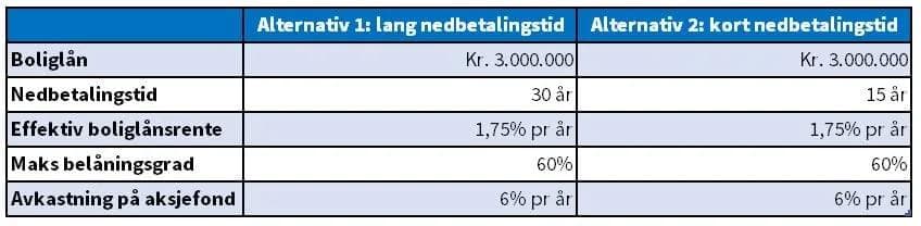 Eksempelet som brukes er et boliglån på kr 3.000.000 (og belåningsgrad på 60 %). Dette kan, for enkelhetens skyld, enten nedbetales over 30 år eller over 15 år. Boliglånsrenten har vi satt til 1,75 % for begge periodene, selv om flere banker tilbyr lån med effektiv rente ned mot 1,50 % per tid.