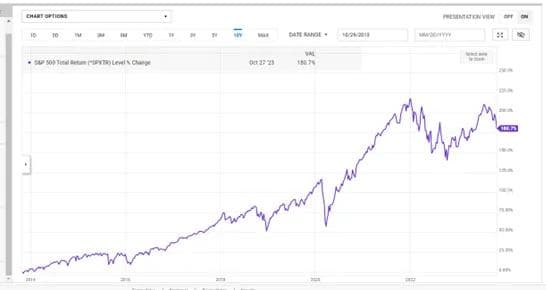 I de 10 årene etter Hussmans spådom om et 40-50% krasj eller elendige avkastninger, var S&P 500 opp mer enn 180% totalt eller 10,7 på årlig basis: