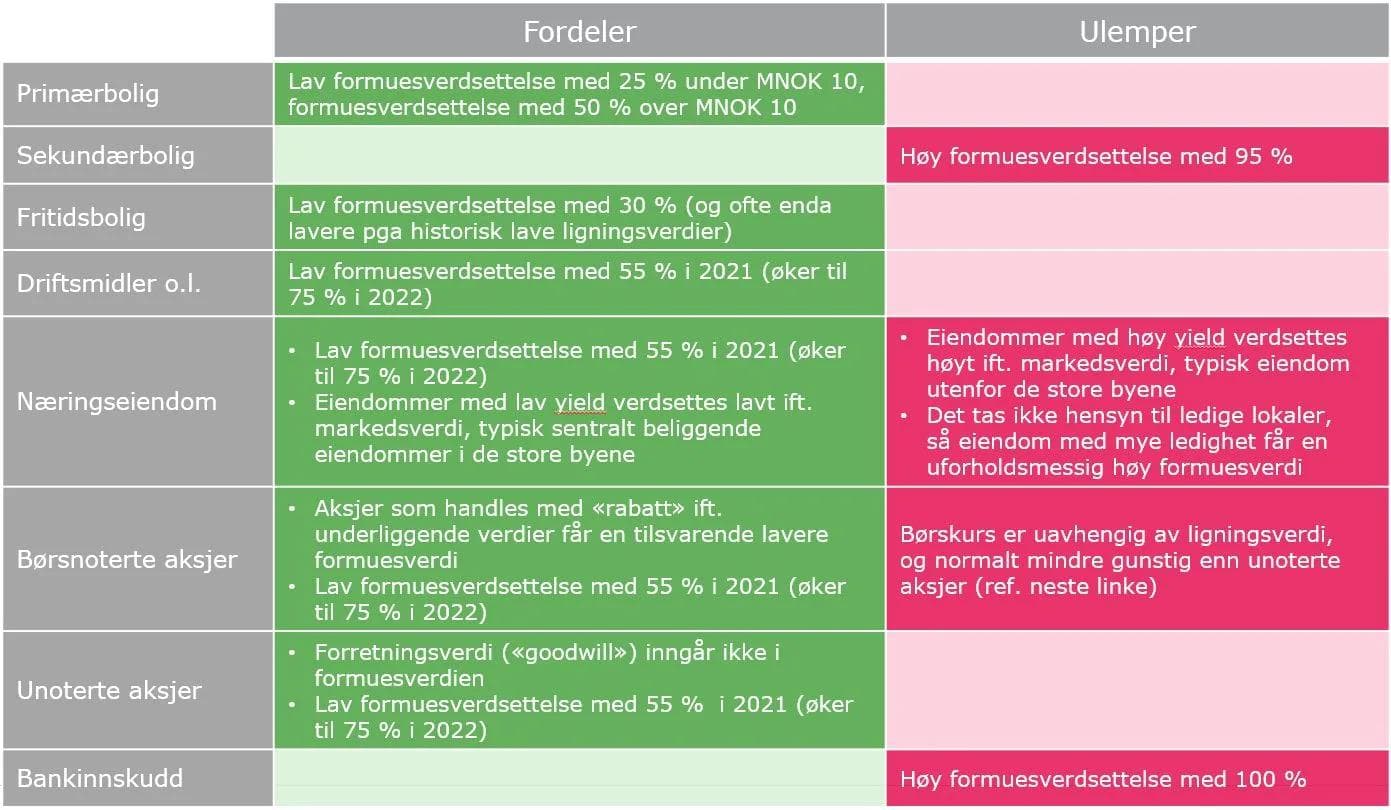 I forbindelse med Stortingsvalget dukket debatten rundt formuesskatt opp igjen. Mange har uttrykt sin mening, særlig om hvem som kommer heldig ut når det gjelder formuesverdsettelse. Men hva er det som faktisk er gunstig? I denne artikkelen vil vi redegjøre for hva som er reglene ved verdsetting av formuesobjekter, herunder hva som er gunstig og mindre gunstig å eie av hensyn til formuesskatt.