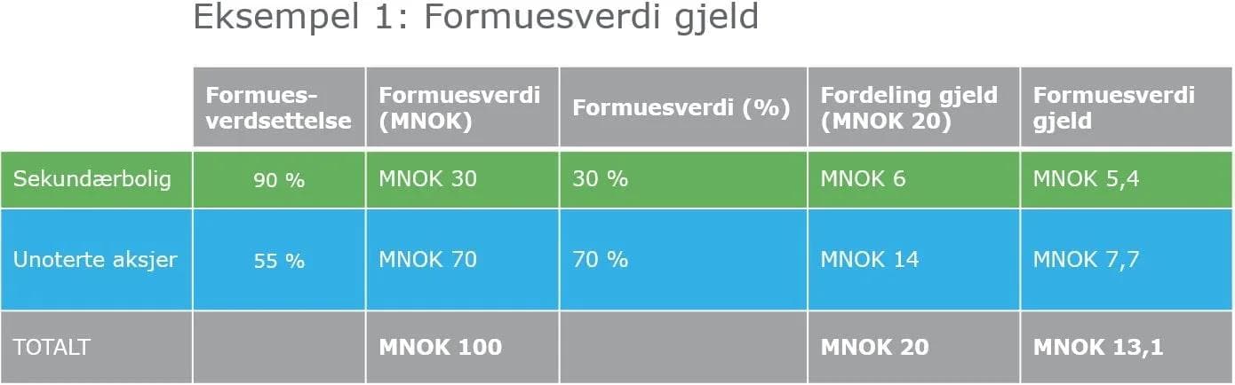 Formuesverdien av privatpersoners gjeld, skal reduseres forholdsmessig i samme forhold som verdien av eiendeler med verdsettingsrabatt. Det innebærer eksempelvis at en person som har halvparten av eiendelene sine i aksjer med 45 % rabatt og den andre halvparten i sekundærbolig med 10 % rabatt, skal redusere halve gjelden sin med 45 % og den andre halvdelen med 10 %.