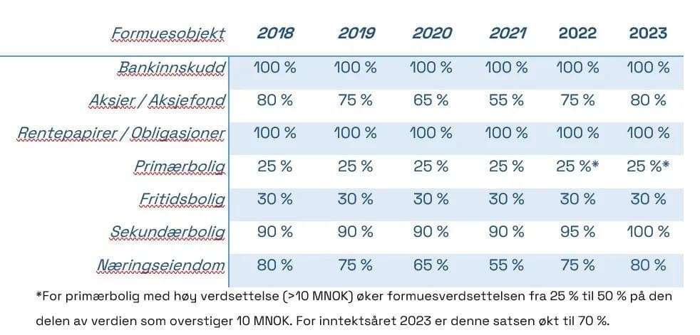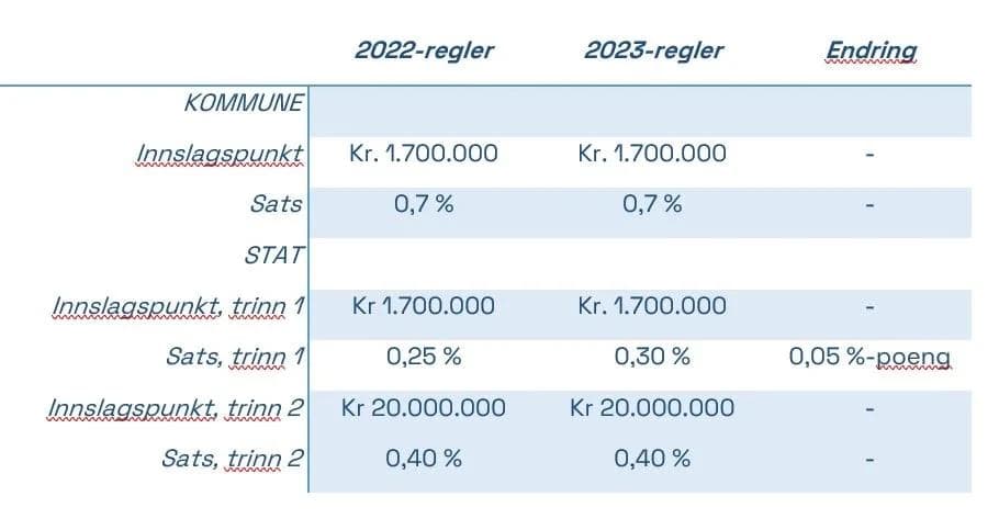 Se tabell under over skatte- og avgiftssatser for formuesskatten, hvor også endringene for 2022 fremkommer: