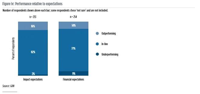 I den årlige undersøkelsen til GIIN blir Impact investorene spurt om deres forventinger til resultater både med tanke på Impact og på finansielle resultater blir oppfylt. Som oversikten nedenfor viser, så er det en meget høy grad av oppfyllelse av begge målsettinger:
