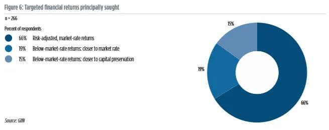 Impact investorer har forskjellige motiv for å gjøre slike investeringer og deres avkastningsforventninger blir derav forskjellig. Investorer med et mer filantropisk utgangspunkt har oftere som mål å bevare kapitalen, andre aksepterer avkastning noe under markedet, mens flertallet forventer å oppnå risikojustert avkastning på linje med eller bedre enn markedet. Grafen nedenfor viser den prosentvise fordelingen mellom disse gruppene: