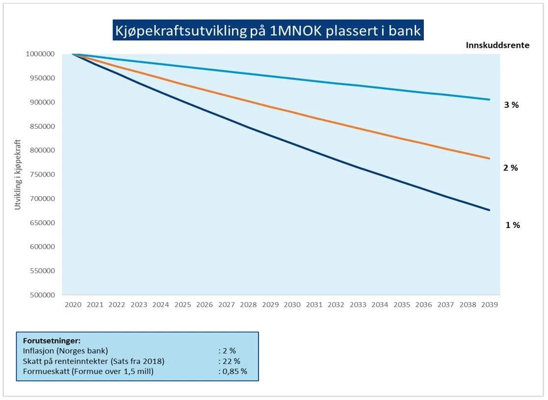 Under ser du en graf som viser de hvordan pengene utvikler seg med en rente mellom 1% og 3%. Her har vi ikke engang skissert effekten av en rente under 1%. Uansett med 1% rente over de neste 20 årene, vil pengene dine ha en verdi i 2039 på 676 000 kr. Ikke særlig attraktivt.