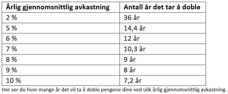 Du tar tallet 72 og deler med den gjennomsnittlige årlige avkastningen du forventer å oppnå. Om du forventer å få 7 % årlig avkastning, så deler du 72 på 7 og får tallet 10,29. Altså tar det 10 år å doble pengene dine om du oppnår 7 % årlig avkastning.