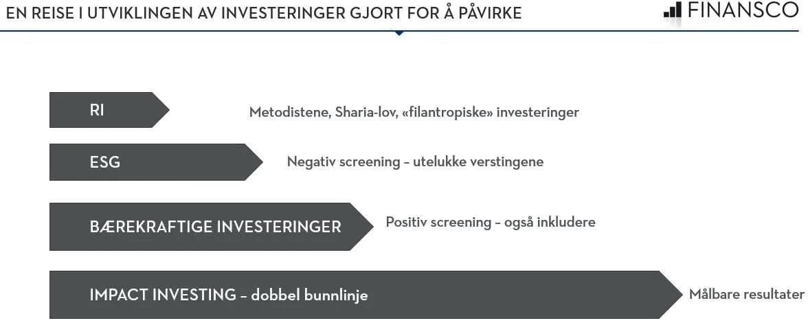Idéen om at vi kan påvirke via investeringer er langt fra ny. Da jeg begynte i finansbransjen og med investeringsrådgivning for 20 år siden husker jeg fortsatt at vi hadde såkalte «SRI» fond i produkthylla, som riktignok verken ble etterspurt eller anbefalt. Socially Responsible Investments fond skulle gjerne investere basert på livssyn, politiske og sosiale hensyn. Dette var forløperen til det man i dag gjerne kaller «ESG» (Enviroment, Social and Governance) eller miljømessige, sosiale og forretningsetiske forhold. Dette oppsummeres ofte som bærekraft, og både i forvaltningen av vår gigantiske fellesformue «SPU» (Statens Pensjonsfond Utland, populært kalt oljefondet) og i norsk kapitalforvaltning har dette etter hvert fått mer og mer oppmerksomhet. Vår konkurrent og bransjekollega Storebrand kan her trekkes frem som hederlig eksempel.