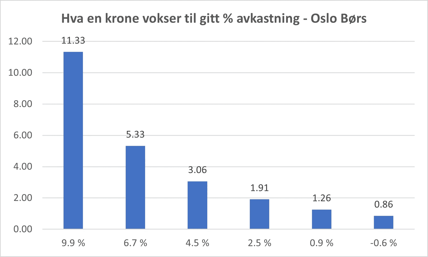 Jeg har brukt de årlige avkastningstallene fra Oslo Børs, tatt de beste dagene vekk, og regnet på hvor mye en krone vokser til over de snaue 26 årene med ulike prosentsatser. Resultatet kan du se i grafen under: