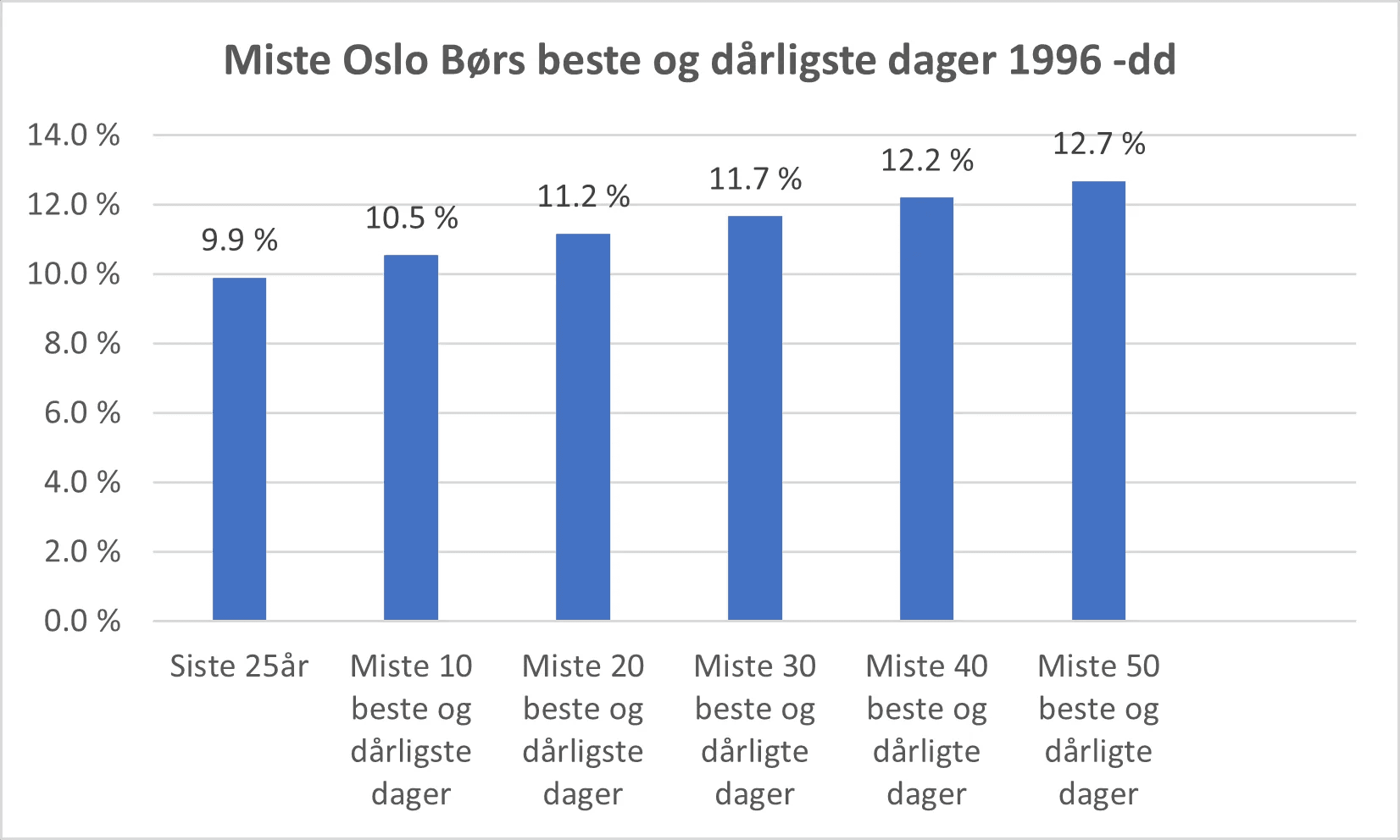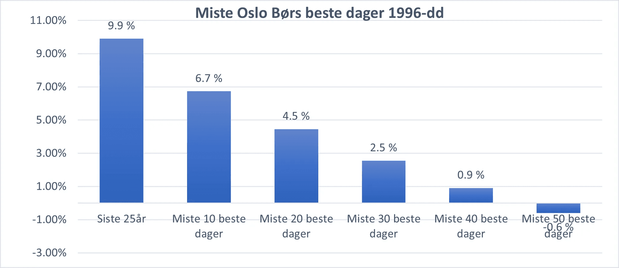 Denne grafen var så interessant å kikke på, og ga meg så tankevekkende refleksjoner, at jeg gjorde en tilsvarende analyse for Oslo Børs. Mine data går omtrent 26 år tilbake i tid, det vil si en noe kortere historikk enn analysen over har tilgang til. Og ikke overraskende er resultatene sammenlignbare. Som min graf under viser, faller da den årlige avkastningen fra nesten 10 % til -0,6 % hvis man går glipp av de 50 beste dagene. For å si det på en annen måte: De 50 beste dagene er under 1 % av alle tilgjengelige dager i analyseperioden.