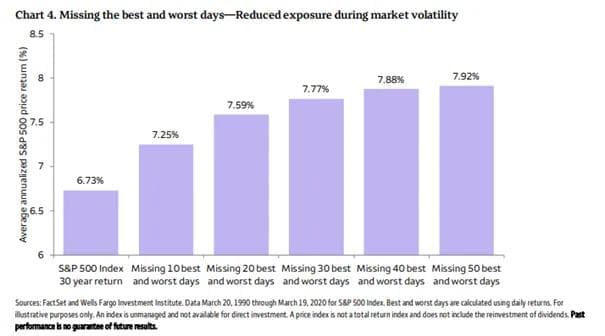 I en nylig publisert rapport fra Wells Fargo fant jeg en oppdatert versjon av følgende analyse: Hvilken avkastning – eller mangel på sådan – en fondssparer oppnår hvis man mister noen av de beste dagene i aksjemarkedet. Grafen kan du se under. Dette er tall fra USA, og den viser hvor mye avkastningen faller dersom man mister de beste dagene.