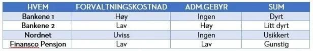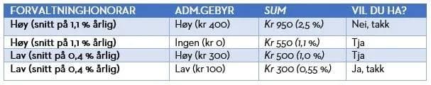 Man vil jo aller helst ha lavt/ingen administrasjonsgebyr + billige fond + god rådgivning.