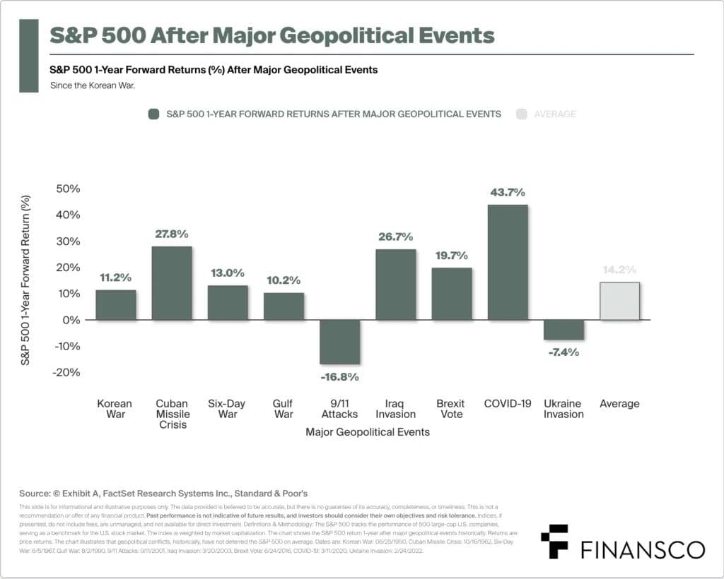 Selv hendelser som skapte betydelig global spenning ga relativt moderate markedsreaksjoner. Under Cubakrisen i oktober 1962, da verden sto på randen av atomkrig, falt Dow Jones bare svakt gjennom de mest intense dagene av konflikten.