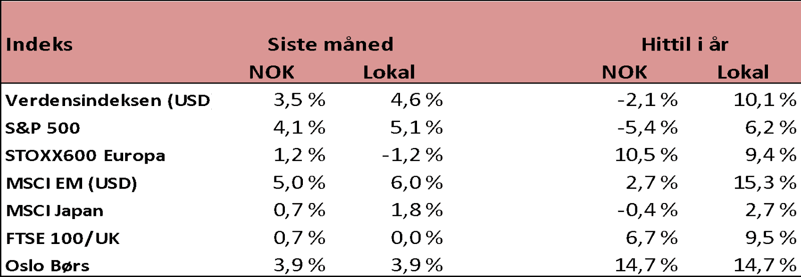 Så langt i år har den norske kronen styrket seg mot alle valutaer med unntak av Euroen. Så positiv avkastning i lokal valuta har i mange av markedene blitt til negativ avkastning i NOK så langt i år. Som investorer har vi hatt medvind fra en stadig svakere krone mot valutaer som euro og dollar de siste 10-15 årene. Om denne trenden er i ferd med å snu, som det kan tyde på, så må vi nå snu om på hvordan tenker og håndterer en slik potensiell utvikling i våre porteføljer.
