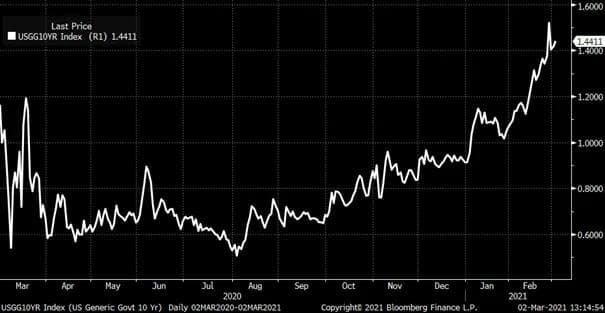 Det at renter stiger er ikke nødvendigvis negativt i seg selv for aksjemarkedene, spørsmålet man må stille er hvorfor rentene stiger. Hvis rentene stiger fordi den økonomiske veksten øker, uten at inflasjonen øker betydelig, er dette positivt for selskapene og aksjemarkedet. Og foreløpig er vel forventningene stort sett på høyere økonomisk vekst fremover uten at inflasjonen umiddelbart skal skyte i været. Det er et bra klima for aksjemarkedet. 2021 ser fortsatt ut til å kunne bli er ok år for aksjer selv om vi observerer litt høyere renter.