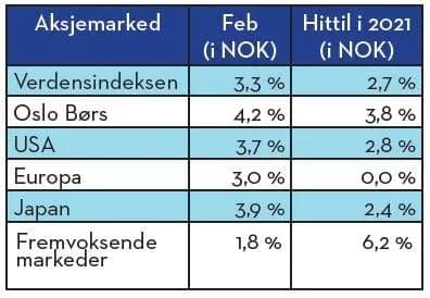 Som i januar, åpnet aksjemarkedene friskt også i februar, før de falt tilbake mot slutten av måneden. Dette fallet var nok i stor grad drevet av raskt stigende langrenter, både i USA og andre land, noe som aksjemarkedet i liten grad satte pris på. Måneden sett under ett ble imidlertid positiv for alle de markedene vi følger. I februar var det ikke så stor forskjell i avkastningen, Oslo Børs var dog et lite hestehode foran med en oppgang på drøyt 4 %. En oppgang i oljeprisen på hele 10 USD gjennom måneden var nok en viktig driver for Oslo Børs. Svakest i februar var fremvoksende markeder med en oppgang på snaue 2 %, for året hittil derimot har fremvoksende markeder gitt best avkastning med en oppgang på drøyt 6 %, mens øvrige markeder har gitt rundt det halve i avkastning.