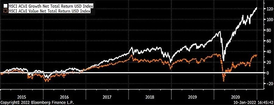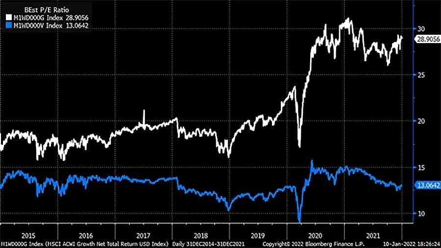 Et siste argument for at 2022 kanskje kan bli verdiaksjenes år, er å henvise til hvordan disse to delene av det globale aksjemarkedet har utviklet seg med hensyn til prising i perioden fra 2015 til 2021.