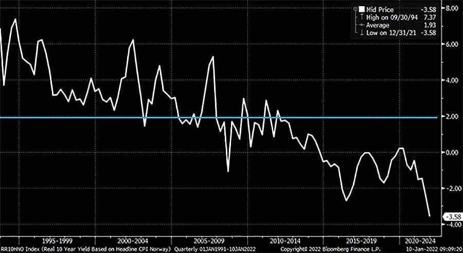Jeg skal vise en ny graf under, men først en liten forklaring. Siden begynnelsen av 2020 har 10 års realrente i USA vært negativ, og den blir nå raskt mer negativ. (Realrente er nominell rente fratrukket total inflasjon.)En negativ realrente betyr i praksis at verdien av investeringen forringes år for år av inflasjon. Det betyr at kjøpekraften din svekkes for hvert år som går med negativ utvikling. Nå er det jo ikke slik sparing og investering skal fungere, men så merkelig er altså finansmarkedet blitt. I Norge er det heldigvis ikke så ille, dersom vi ser på realrenten basert på kjerneinflasjonen.