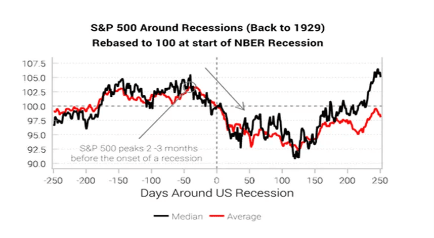 Jeg støtter meg igjen til tall fra Variant Perception, og en graf som viser snittet av alle resesjoner siden 1929 i USA, og illustrerer hvordan SP500 har gjort det i forkant av de NBER-definerte resesjonene – og i tiden etter.