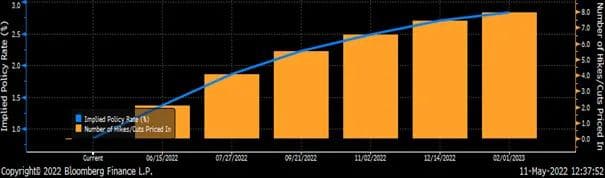 I USA eksisterer det finansielle kontrakter som viser hvor FED-renten forventes å ligge frem i tid. Den siste grafen jeg har tenkt å vise, er fra Bloomberg Finance, og ut fra den kan vi lese hva som er priset inn av antall rentehevinger frem mot begynnelsen av neste år, samt hvor høy renten vil være.