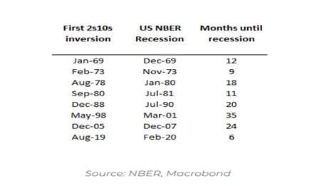 Ta en kikk på tabellen under, hentet fra Variant Perception. Den viser hvor lang tid det tar fra rentekurven inverterer, til NBER erklærer resesjon. Her kan vi se en oversikt over de siste 50 årene, og i venstre kolonne ser vi datoene for når rentekurven har invertert. I midterste kolonne listes datoene for når NBER erklærer resesjon, og i høyre kolonne vises antall måneder som går fra inverteringen er et faktum til det faktisk blir offisielt erklært tilbakegang.