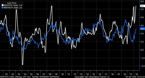 Som grafen under viser, ligger kjerneinflasjonen i Norge pt. på 3,4 % (blå graf), noe som er godt over Norges Banks inflasjonsmål på 2 %. For samlet inflasjon er dog bildet en god del brattere. Her er nå inflasjonsmålingene på det høyeste observerte nivå de siste 20+ årene (hvit graf).