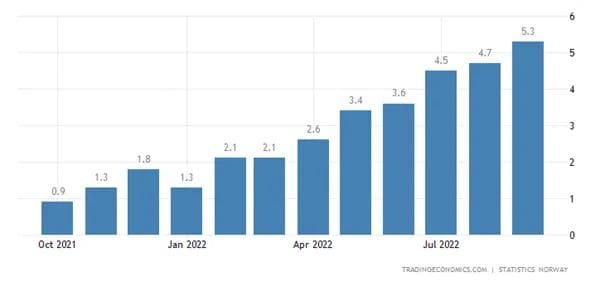Er det et makroøkonomisk nøkkeltall som følges tett i disse dager, så er det konsumprisutviklingen i de ulike land. Konsumprisindeksen steg 1,4 % opp fra august til september, og har lagt på seg med 6,9 prosent fra september 2021 til september i år. I stor grad er det matvareprisene som er den viktigste årsaken til oppgangen. Som regel faller prisene noe inn mot høsten, men i år har de holdt seg stabile, og svakt økende. For å finne en høyere tolvmånedersvekst må vi tilbake til 1988, og totalt sett må vi se på 1980-tallets høye vekst i matvarepriser for å finne sammenlignbare scenarier.