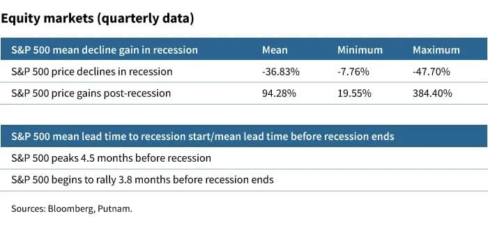 Det som er hakket mer interessant er vel hvordan aksjemarkedene klarer seg før, under og etter resesjonsperioder.