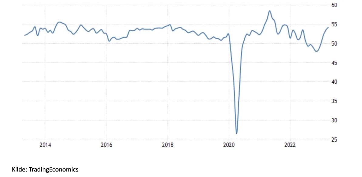 Hvordan ser så de siste PMI-målingene ut? En Global PMI-måling for hele næringslivet ligger i dag på noe over 54, som indikerer at aktivitetsnivået er økende. Nivået har kommet bra opp siden årsskiftet hvor den globale PMI-målingen lå på ca 48.