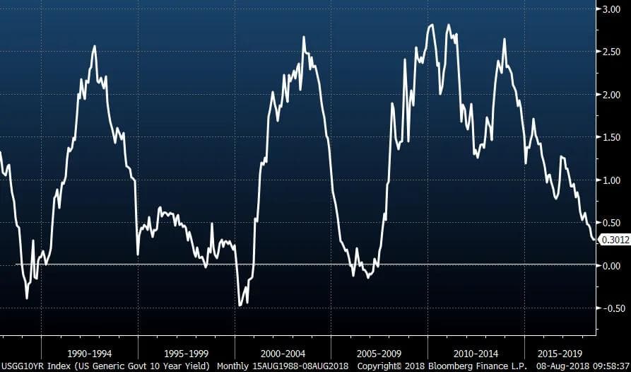 Når rentekurven inverterer vil det si at de lengste rentene er lavere enn de korte rentene. Studier, foretatt av den amerikanske sentralbanken, viser at historisk har en invertert rentekurve vært en god indikator på at USA er på vei inn i en resesjonsperiode med negativt økonomisk vekst. Siden 1955 har denne indikatoren vært korrekt 9 av 9 ganger!