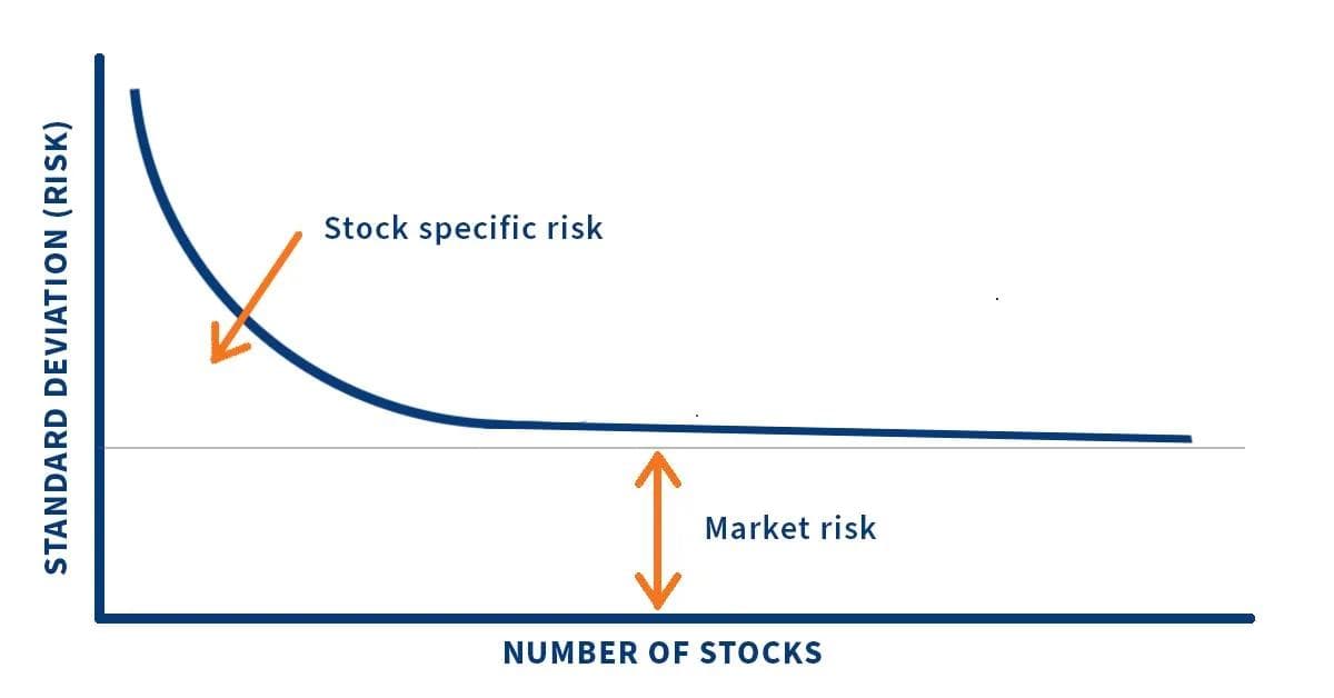 Det enkle svaret er som vi har vært inne på, å fordele risikoen på flere plasseringer. Såkalt diversifisering. Vi plasserer altså investeringen på ulike steder i aksjemarkedet, eksempelvis i flere selskaper. Grafen under illustrerer da hvordan den usystematiske risikoen reduseres i takt med antall selskaper i porteføljen, der risikoen synker med spredningen. Jo bredere sammensetning, desto lavere grad av risiko. Det er likevel verdt å merke seg at grafen flater ut.