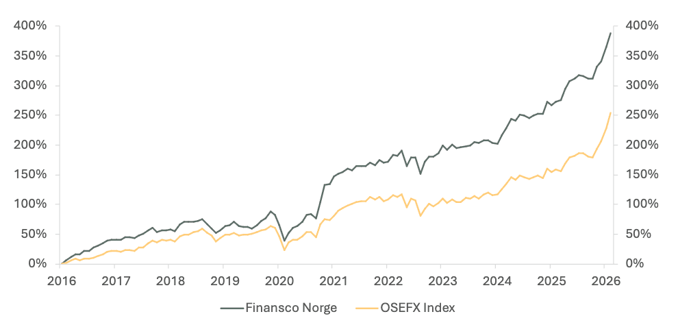 Finansco har siden 2016 levert 388 prosent avkastning i vår strategi for norske aksjefond, og Oslo Børs Fondsindeks har i samme periode levert 254 prosent, altså har Finansco bidratt med 134 prosentpoeng meravkastning, som følge av gode fondsvalg og aktiv oppfølging og fondsbytter for våre kunder. Vi tror dette tåler en sammenligning med den jevne Nordnet eller «gjør det selv»-investor. De seneste årene er vi også en av få forvaltere som har levert meravkastning i vår globale strategi, da ikke ved å betale for aksjeplukking, men ved å ha overvekt i riktig geografiske område i indeksfondporteføljen.
