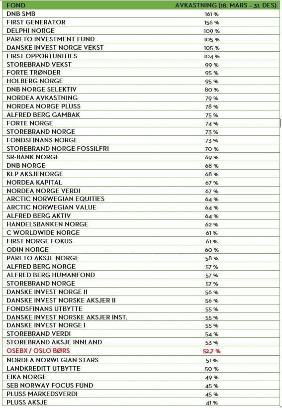Siden vi gav anbefalingen om å velge aktivt forvaltede norske aksjefond fremfor indeksfond den 18. mars 2020, og ut året, har hele 40 av de 46 norske aksjefondene i vårt utvalg slått Oslo Børs – det er ekstremt! Vi traff altså blink!