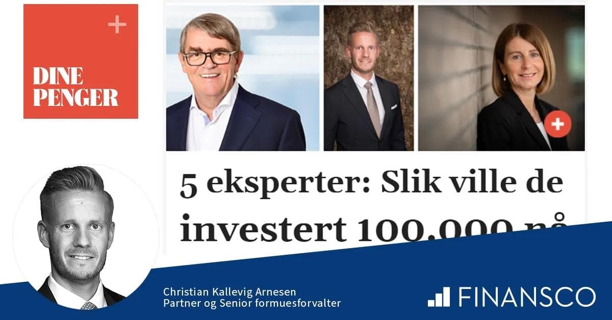 Finansco bidrar, sammen med blant annet Pål Ringholm (Sparebank 1 Markets) og Jan P. Sissener, med våre råd om hvordan man bør plassere kr 100.000 i dagens marked. Artikkelen kan leses bak betalingsmur hos både Dine Penger og VG+.Kort oppsummert sa vår partner Christian Kallevig Arnesen følgende da journalisten spurte: med langsiktig fokus bør aksjeandelen være høy, og bankkonto er en dårlig langsiktig investeringsbeslutning. Videre bør man tenke på fremtidens megatrender når deler av aksjepengene skal plasseres, og at det med dagens aksjemarkedsprising generelt er lov til å være litt taktisk ved å ha en noe større andel av sine totale plasserte midler i rentefond enn normalt. Ha en stridskasse i rentefond – sørg for å få god oppfølging