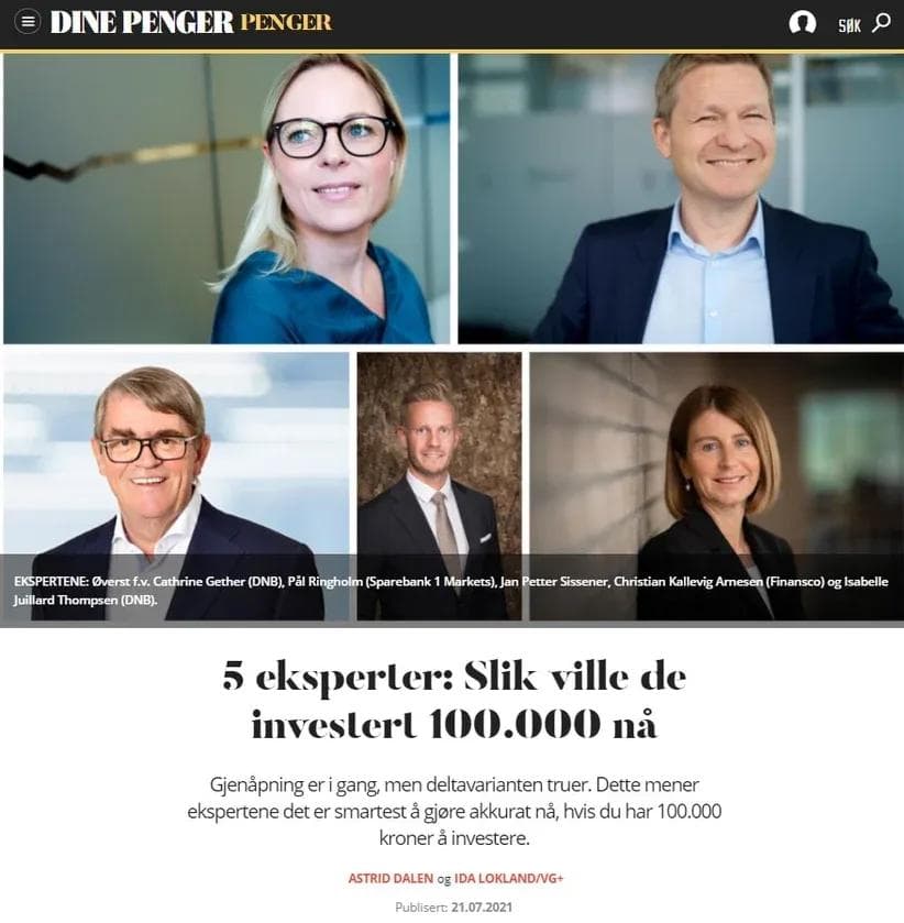 Finansco bidrar, sammen med blant annet Pål Ringholm (Sparebank 1 Markets) og Jan P. Sissener, med våre råd om hvordan man bør plassere kr 100.000 i dagens marked. Artikkelen kan leses bak betalingsmur hos både Dine Penger og VG+.
