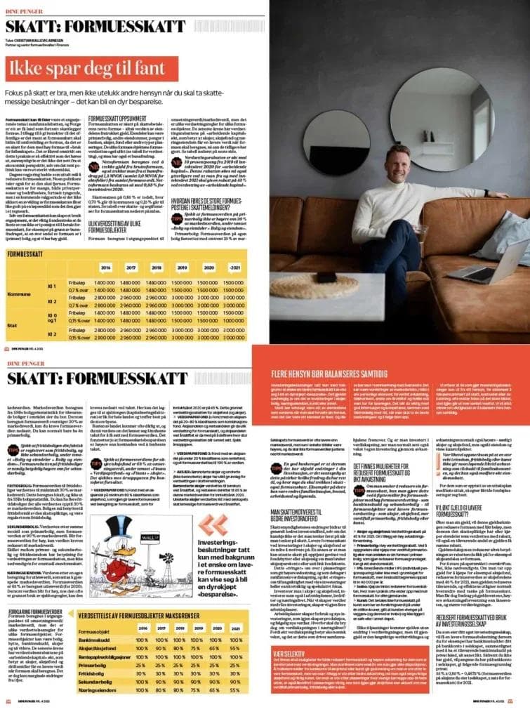 Ekspertenes beste skattetips – Dine Penger. Finansco-partner Christian Kallevig Arnesen bistod i et ekspertpanel om skatt i aprilutgaven til Dine Penger, sammen med blant annet Hallgeir Kvadsheim. Les Christians råd om formueskatt. De andre artiklene med tips og råd til skatt finner man bak betalingsmur eller ved å kjøpe bladet Dine Penger denne måneden.