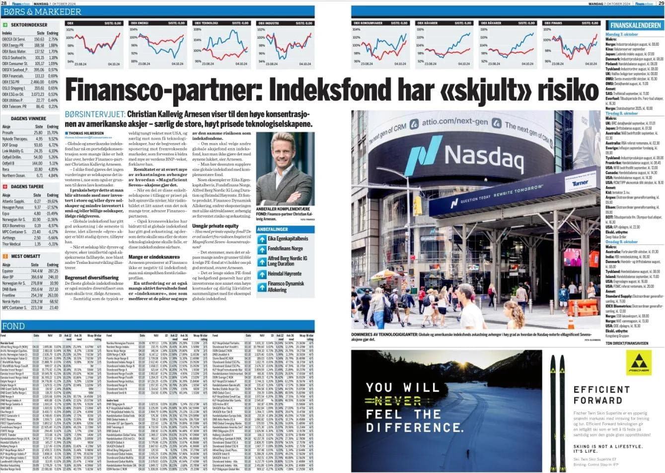 Christian Kallevig Arnesen fra Finansco trekker frem at indeksfond, som er blitt et populært investeringsvalg, kan ha betydelig risiko på grunn av stor eksponering mot amerikanske teknologiselskaper med høy verdsettelse. Han forklarer at denne høye konsentrasjonen gjør fondene sårbare dersom markedene for disse aksjene opplever en korreksjon.
