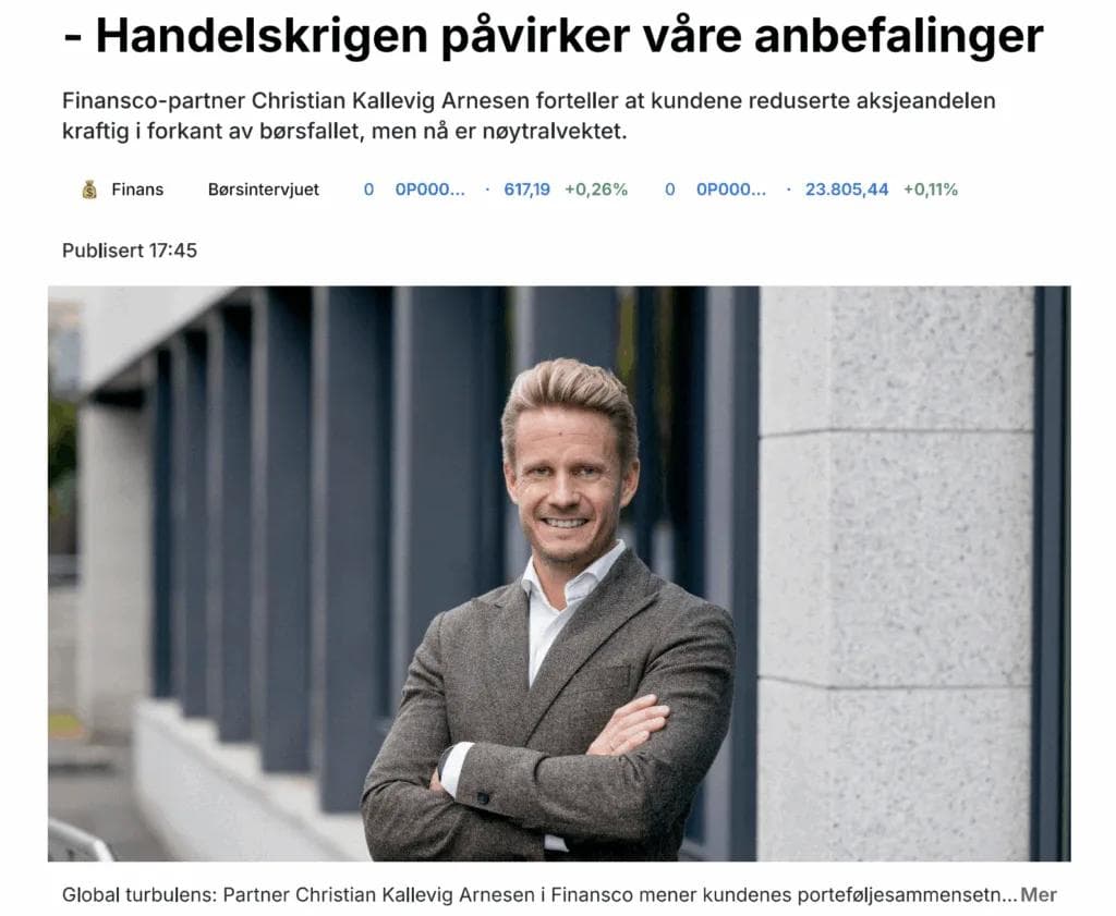 Finansco-partner Christian Kallevig Arnesen forteller at kundene reduserte aksjeandelen kraftig i forkant av børsfallet, men nå er nøytralvektet. Finansavisen, 6. mai.