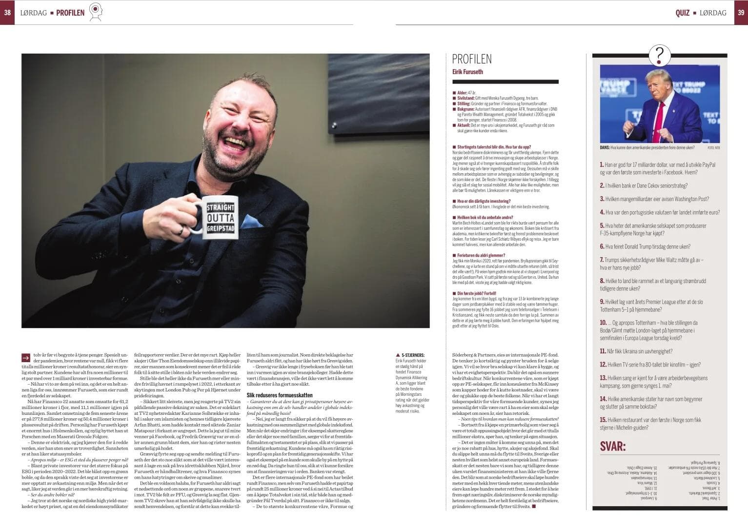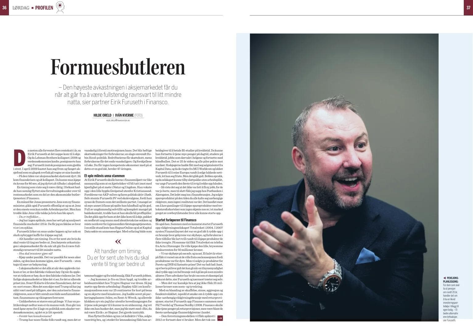 I helgeutgaven av Finansavisen fikk gründer og partner i Finansco, Eirik Furuseth, prate blant annet om karrierestarten hos Hegnar, forløperen til Finansco som feilet, at han har vært ekstremt god på timing og hvordan Finansco plasserer seg når det blåser som verst i Finansmarkedet.