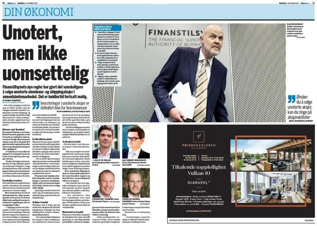Partnerne Christian Kallevig Arnesen og Eirik Furuseth kommenterer om utfordringer med å omsette unoterte aksjer, etter at Finanstilsynet har kommet med nye retningslinjer. – Det er nå litt uenighet rundt hva som er tillatt og ikke, men de viktigste aktørene innenfor omsetning av unoterte shipping- og eiendomsaksjer har sluttet å tilby slik handel til «ikke-profesjonelle» kunder, opplyser partner Christian Kallevig Arnesen til Finansavisen